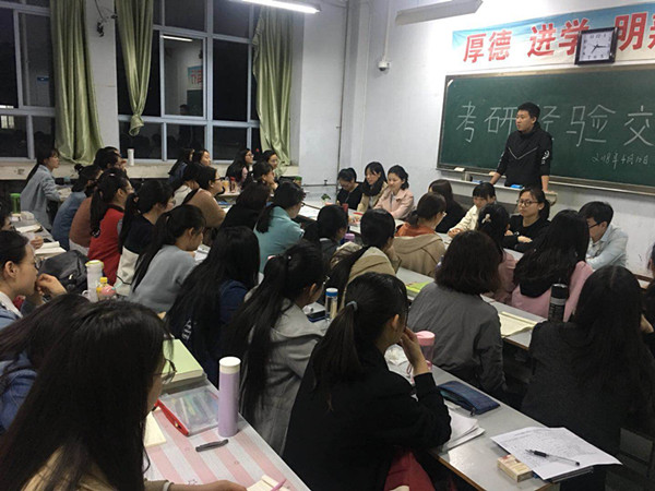 在交流会上,8位“准研究生”从考研准备、考研复习计划和进度安排、报考院校选择、真题训练、复习技巧等几个方面谈了各自的考研历程。其中,被俄罗斯圣彼得堡国立理工大学录取的赵阳同学详细介绍了赴俄罗斯留学所需的语言学习、入学申请和面试的经验;被南京航空航天大学录取的赵飘同学着重谈了英语课程的学习方法和技巧,并为同学们推荐了“张剑黄皮书”等考研英语复习资料;被武汉理工大学录取的刘星星同学着重谈了政治课程的复习计划,并对“肖秀荣精讲精练”、“肖四、肖八”的学习进行了经验介绍;被北京信息科技大学录取的李海丽同学则从如何对报考院校历年真题进行题型分类、寻找考点规律等方面做了介绍;刘正堂、王亚青、朱灵恩、王珂珂等同学从复习时间、院校选择、考研科目复习计划、真题训练等方面与参会学生进行了互动和答疑。
