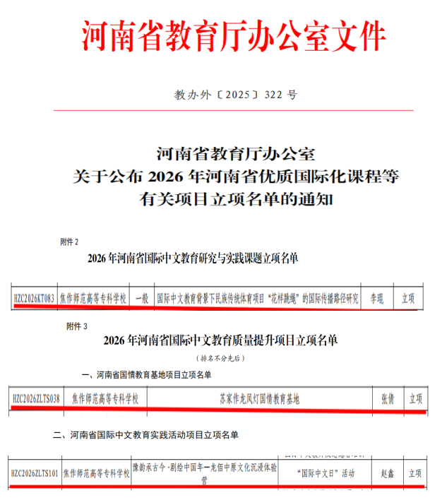 近日,省教育厅公布2026年河南省优质国际化课程等项目立项名单,我校3个项目成功立项。