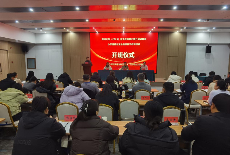 12月14日上午,河南省“国培计划(2025)”县级骨干教师小学道德与法治项目开班仪式在焦作市凯悦大酒店二楼会议室举行。项目统筹负责人韩小荣、马克思主义学院副院长张珺珺、原瑞娟,培训班班主任及全体学员参加了开班仪式。仪式由原瑞娟主持。
