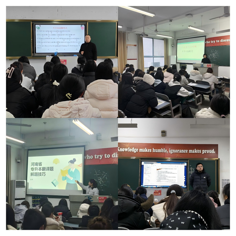 为全面落实学校关于提升人才培养质量与学生学历层次的工作要求,切实破解全校各专业学生专升本英语备考痛点,助力学生搭建坚实的升学桥梁,在教务处的总体协调和具体指导下,外语经贸学院精准对标“三年出成绩、五年创品牌”核心任务,充分发挥学科专业优势,整合优质教学资源,创新采用“课堂教学(一年级)+ 公共选修(二年级)+ 集训冲刺(三年级)”差异化载体,明确阶段时间表,全力构建从学校领导到任课教师,从课堂教学到课后管理,从学习辅导到心理支持的“全方位、立体化、多层次、可持续”的科学辅导体系,为全校专升本学子送上精准高效的专升本考试英语科目备考“大餐”。