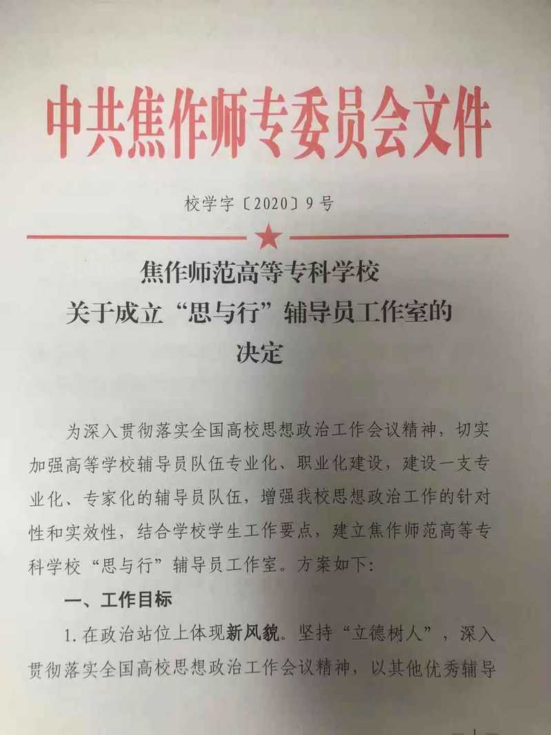 为进一步加强我校辅导员队伍专业化、职业化建设,提升大学生思想政治教育工作实效,结合学生工作实际,经研究决定,成立焦作师范高等专科学校“思与行”辅导员工作室。